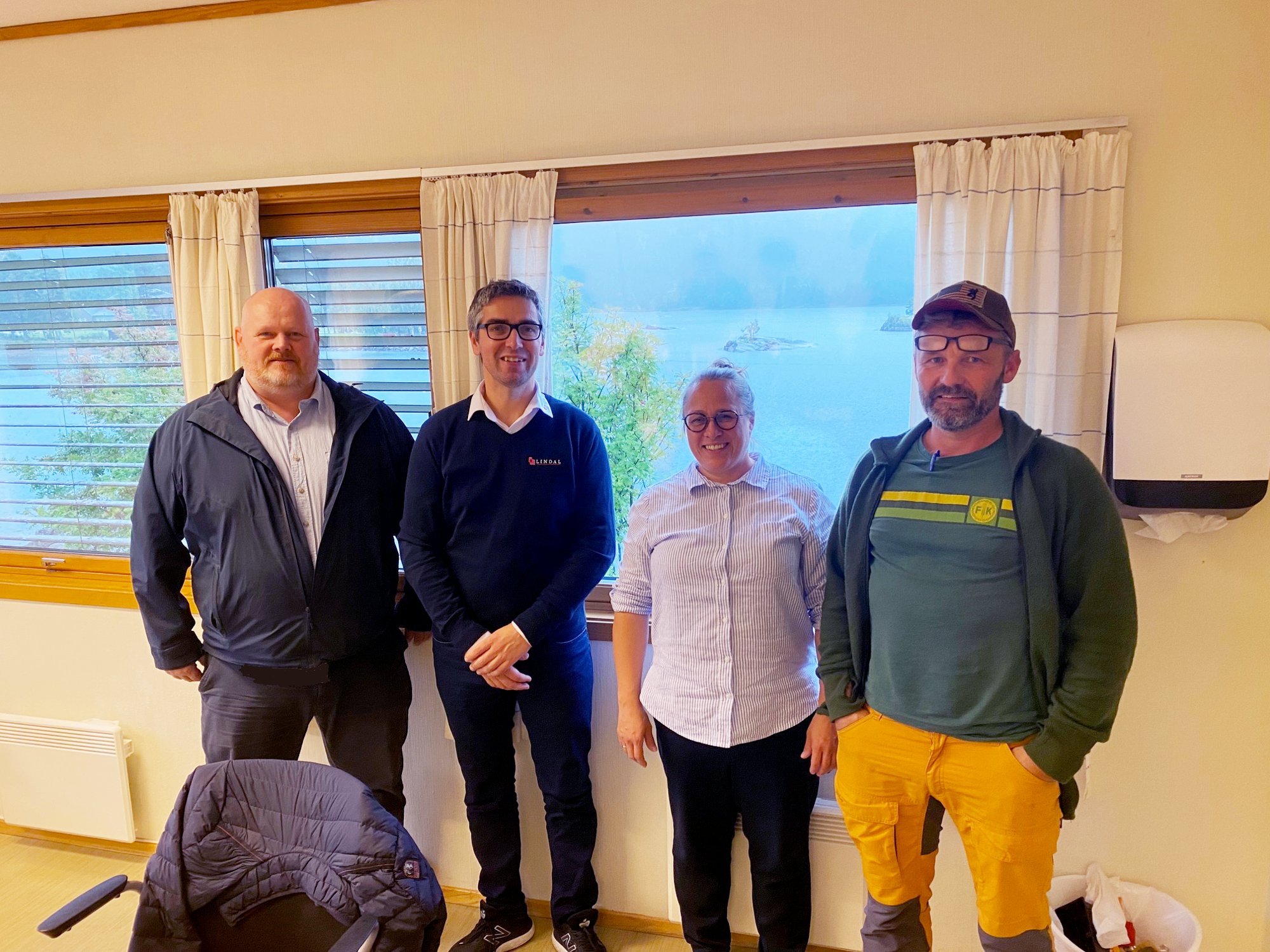 STORKONTRAKT: Her fra signeringsmøtet i Nissedal. Fra venstre står Bernt Olav Mesel (driftsleder LM Entreprenør), Kjell-Rune Lindal (daglig leder Lindal Hus) , enhetsleder Kristin Kyrkjerud Vaa og Ben David Berås (begge Nissedal kommune). Foto: Privat